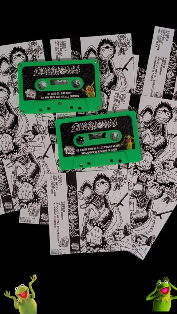 This one is set to flip your lid. Quick, slap in the face egg punk with a raging, manic enthusiasm from Calgary, Alberta! It’s amazing. It’s the latest from Kermit obsessed BUG SWALLOW! Eight blistering tracks of fun, creative and fast as fuck lo-fi punk that’s heavy on the twisted ass synth. It’s a party all the way through, a tape that grabs your attention immediately and keeps you enthralled as it threatens to careen off course. It’s a dope release and we’re stoked to drop 25 copies on lime green cassette shells. Out now on Knuckles on Stun.